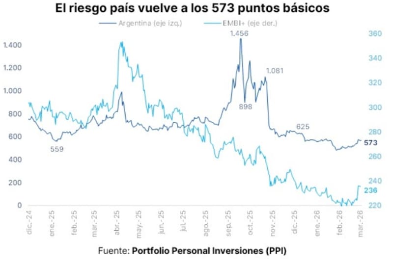 La caída del precio de los bonos hizo que el riesgo país regrese a los 573 puntos.