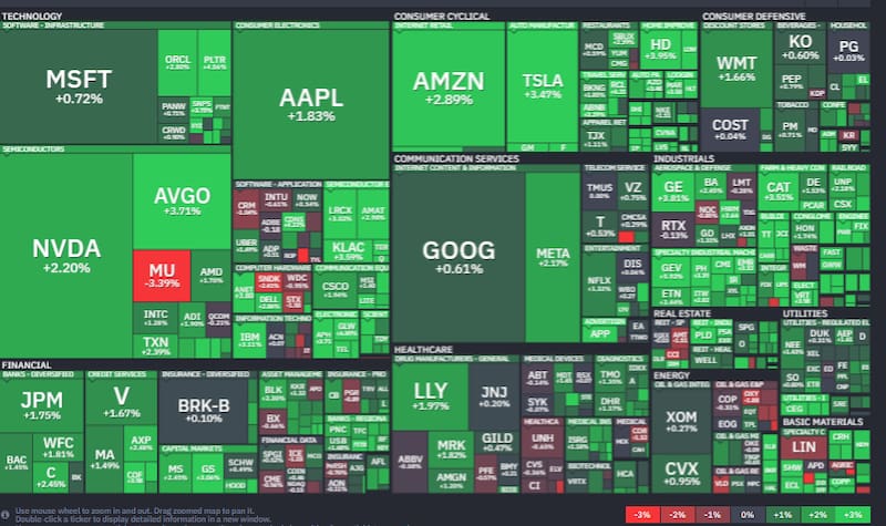 En números, el movimiento es contundente. El Dow Jones avanza 1,7%, el S&P 500 sube 1,5% y el Nasdaq gana 1,8%.