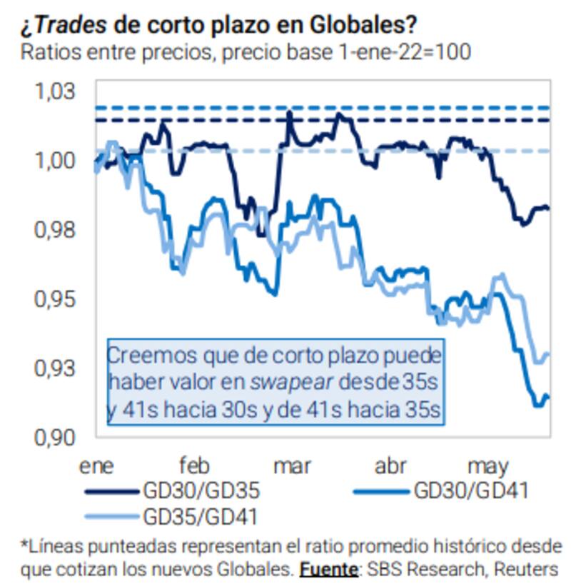 "Dentro de la curva de Globales vemos valor de corto plazo en pasar desde GD35 y GD41 hacia GD30 y o desde GD35 hacia GD41, dados los ratios históricos entre precios desde el canje. Creemos que tanto AL30 como GD30 tendrían considerable upside de ganar probabilidad su pago de amortización en 2024, por lo que ciertos inversores podrían ver atractivo en ellos", explicó el especialista.