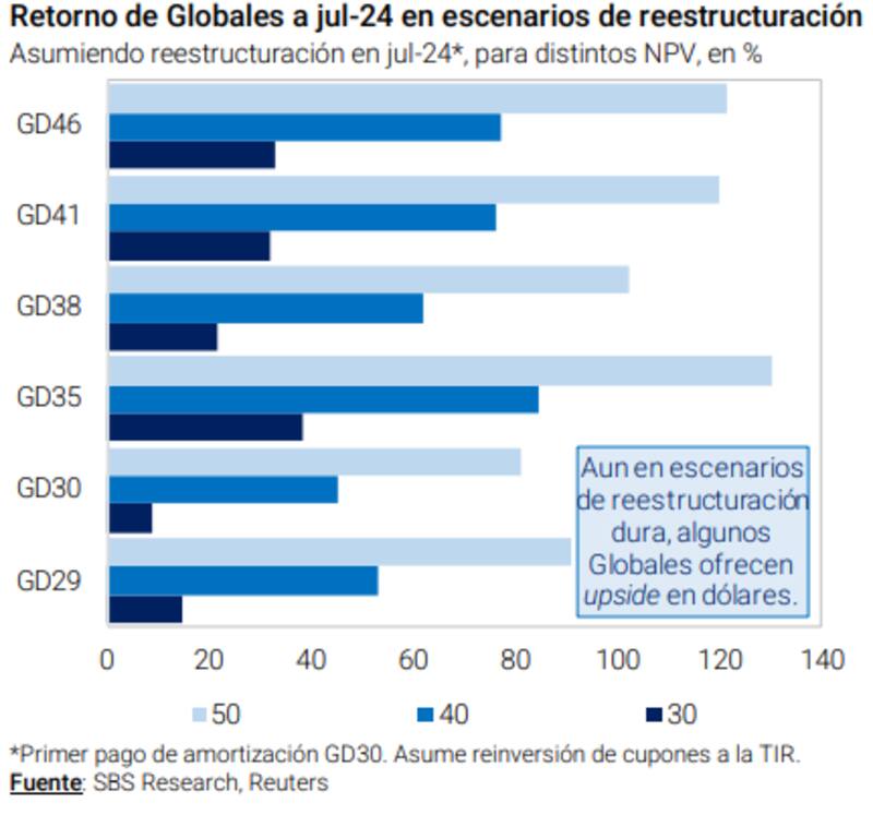 "Si bien las condiciones financieras globales han empeorado y ponen cierto techo al upside de los bonos argentinos en dólares, estimamos que hay atractivo para perfiles con apetito por el riesgo en GD35 y GD41, con retorno total más que interesante aún en escenarios de una nueva reestructuración", sostuvo.