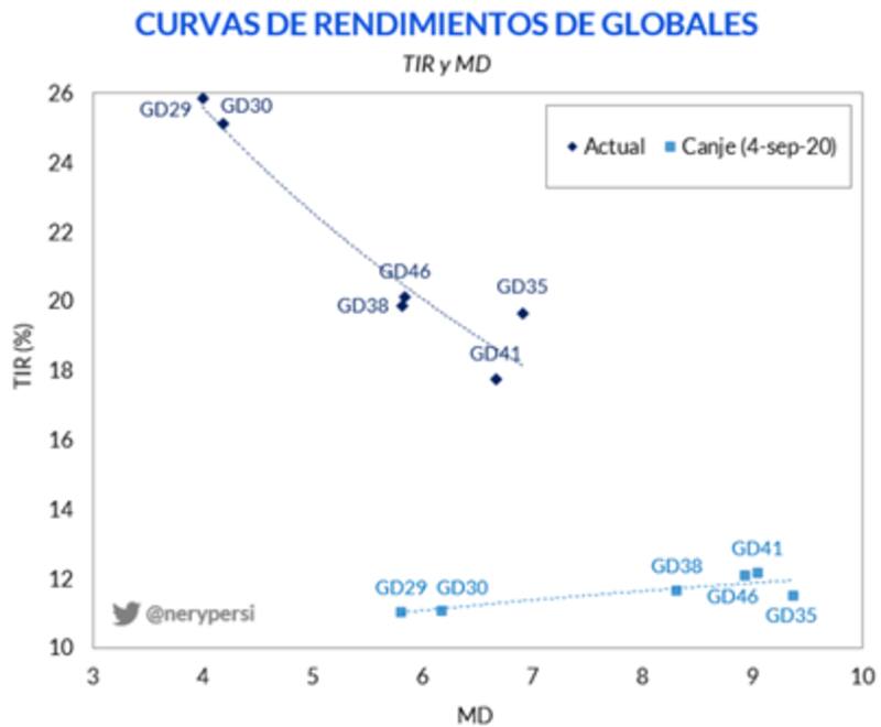 Por otro lado, todos los tramos de la curva argentina operan con paridades debajo del 35%, lo cual implica que el mercado desconfía de la capacidad y/o voluntad de pago del Gobierno sobre el pago de sus compromisos de deuda.