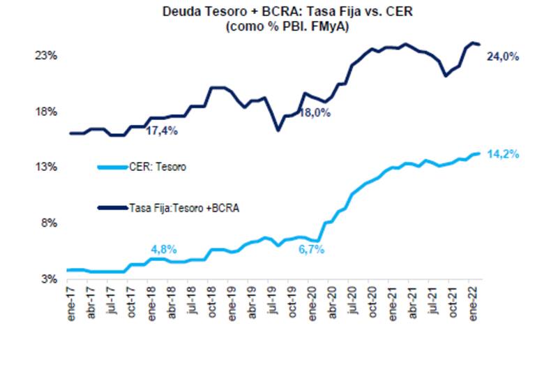 "Todo el financiamiento neto de 2021 y lo que va de 2022 fue deuda indexada", apuntó por su parte Gabriel Caamaño Gómez, de Consultora Ledesma. "Estamos financiando todo el agujero fiscal con deuda indexada y refinanciando parte de los vencimientos en pesos con deuda indexada", advirtió.