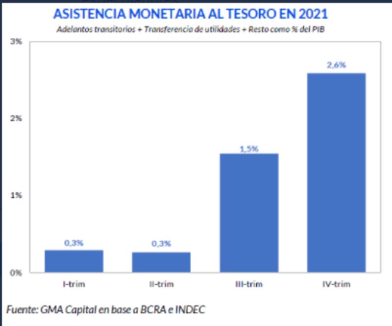Lo cierto también es que hay muchos pesos en el mercado que necesitan encontrar un destino final para no perder contra la inflación. Solo en el último trimestre 2021, de hecho, se emitió 2,6% del PIB para saldar el rojo fiscal. Esto es más de un punto adicional respecto a los 3 meses anteriores.