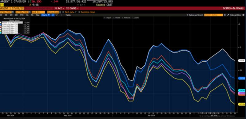Desde los máximos de fines de abril hasta la fecha, el Global 2029 muestra una baja de 8%. En el caso del Global 2030, este retrocede 11,7%, mientras que el GD35 cae 15% desde los picos de abril.