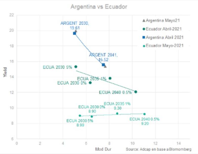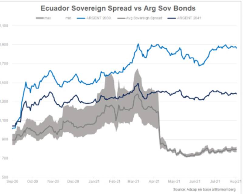 "Luego de las reestructuraciones de Ecuador y Argentina, ambos países se venían moviendo de manera similar en término de spreads. Los dos con curvas invertidas, pero Ecuador operando entre 200 y 300 puntos por debajo de Argentina a partir del programa de Extended Fund Facility alcanzado en noviembre de 2020", indica Casabal.