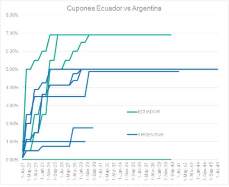 "Esta diferencia es particularmente relevante para los bonos que vencen en 2030. Mientras que el Ecuador 2030 ya está pagando 5%, el Argentina 2030 solo paga 0,50% y recién empezará a pagar 1,75% a partir de 2028", comentó.