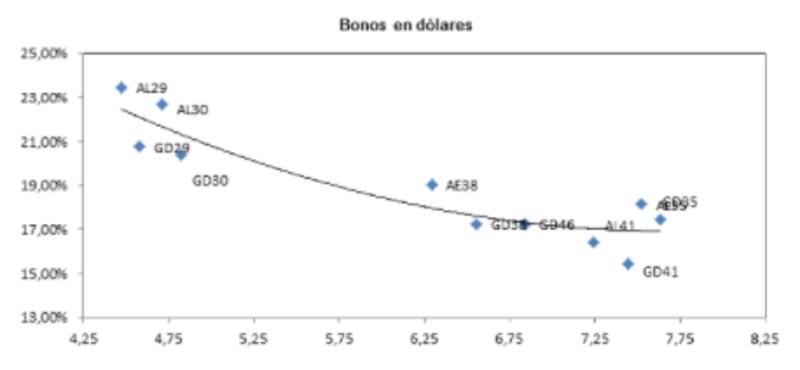 La deuda de Argentina rinde 19,6% en el tramo corto y mas del 15% en el tramo largo, con pendiente negativa.