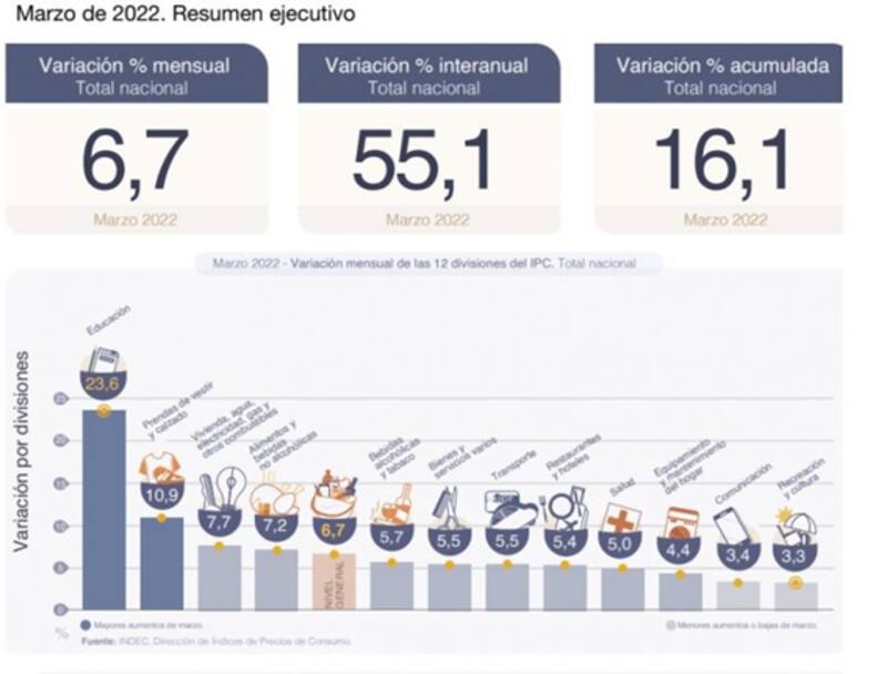 La inflación interanual fue del 55,1% y en el acumulado del 2022 fue del 16,1%. A su vez, la economía argentina lleva 10 meses consecutivos con una inflación interanual por encima del 50 por ciento.