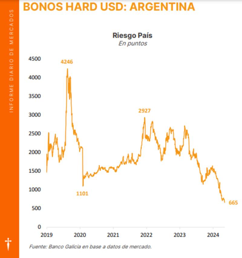 Gracias al impresionante rally en los bonos soberano argentinos, el mismo colapsó desde los 2900 puntos a comienzo de la actual gestión hasta los 665 puntos actualmente.