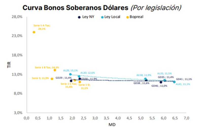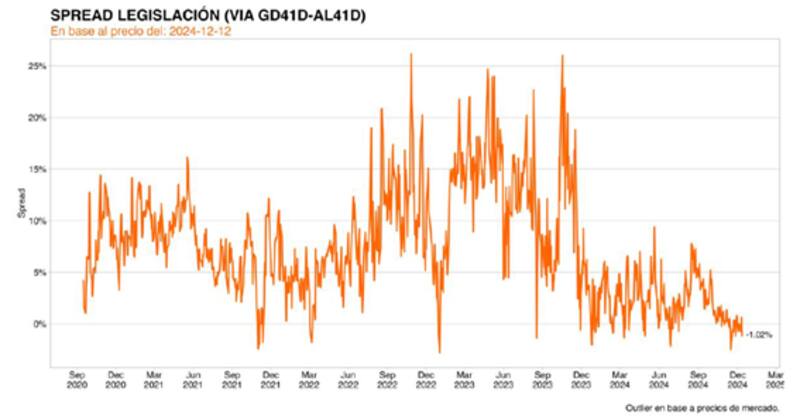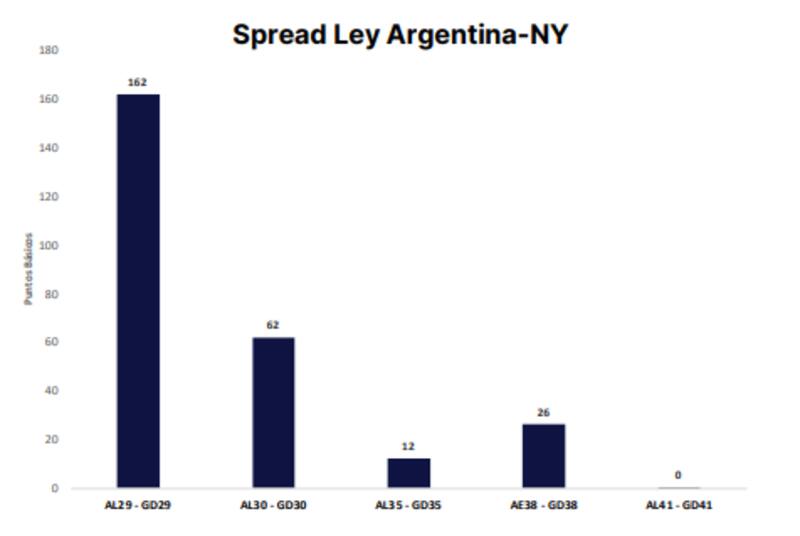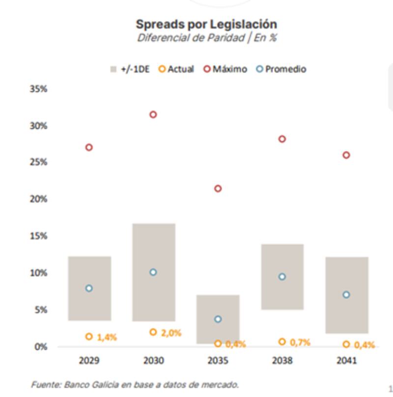 "Los spreads por legislación de la curva soberana se encuentran muy cerca de sus mínimos. En promedio desde el canje de 2020, GD41 cotizó un 7,5% por encima de AL41, y a precios actuales esa diferencia es de solo 0,2%. En los vencimientos 2030 y 2035 se detecta una dinámica similar", detalló