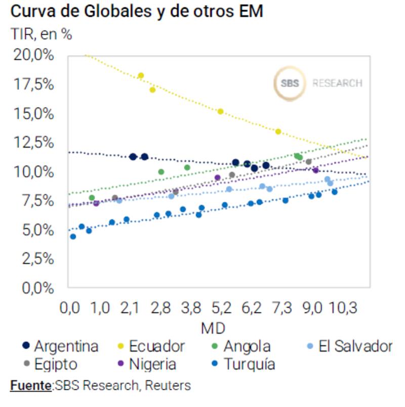 "Para un enfoque de corto plazo, vemos una mayor alza en los bonos GD30 y GD29, ya que estos bonos han tenido un rendimiento inferior al del GD35 y sus pares de Ecuador. Suponiendo que vuelvan al pico de sus ratios respecto de ECUADOR, los plazos más cortos 2029 y 2030 generarían un retorno de 12,5%, que se compara con el 10% del GD35", explicaron desde Adcap.