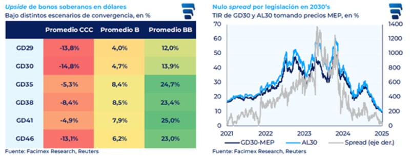 "En nuestro escenario, los bonos del tramo largo presentan el mayor potencial. En particular, destacamos el GD35. En un escenario donde el riesgo país cae a 400 pb, este bono ofrecería ganancias del 20% en los próximos 12 meses, en tanto que si el riesgo país se mantiene estable, ofrecería ganancias del 13%. Optamos por bonos Ley Nueva York, ya que los spreads legislativos están en niveles bajos. En el tramo corto, recomendamos el GD30 (TIR 10,2%)", explicó.