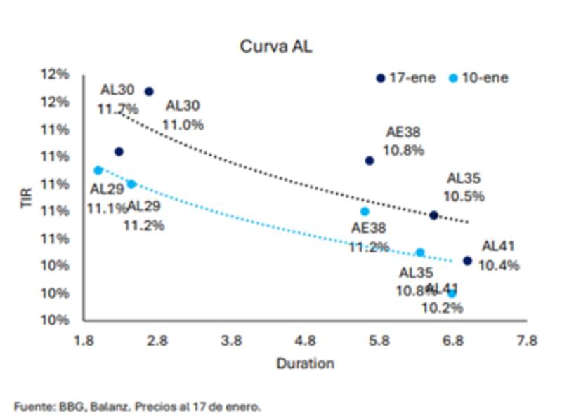 "Seguimos viendo espacio para compresión de spreads en Globales, manteniendo a GD35 como top pick, con nuestros análisis apuntando a que es el bono con mejor retorno total a un año vista dentro de la curva. En tanto, sostenemos que, a estos niveles de spread de legislación, sigue teniendo sentido pasar de AL a GD", dijo Franco.