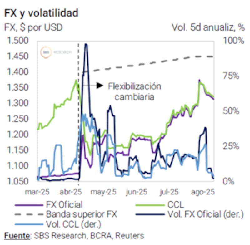La volatilidad a 5 días en el tipo de cambio oficial y en el contado con liquidación retrocedió a niveles del 5%, desde valores cercanos al 30% y 40% que se habían registrado semanas atrás.