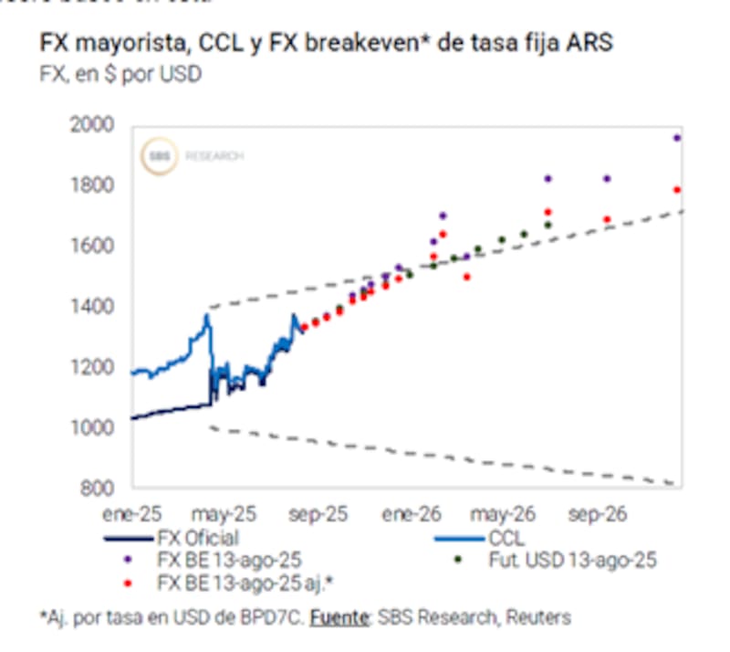 Pedro Siaba Serrate, head de estrategia de PPI, remarcó que los instrumentos en pesos con vencimientos a partir de enero están exhibiendo tipos de cambio de indiferencia por encima del nivel de la banda superior.