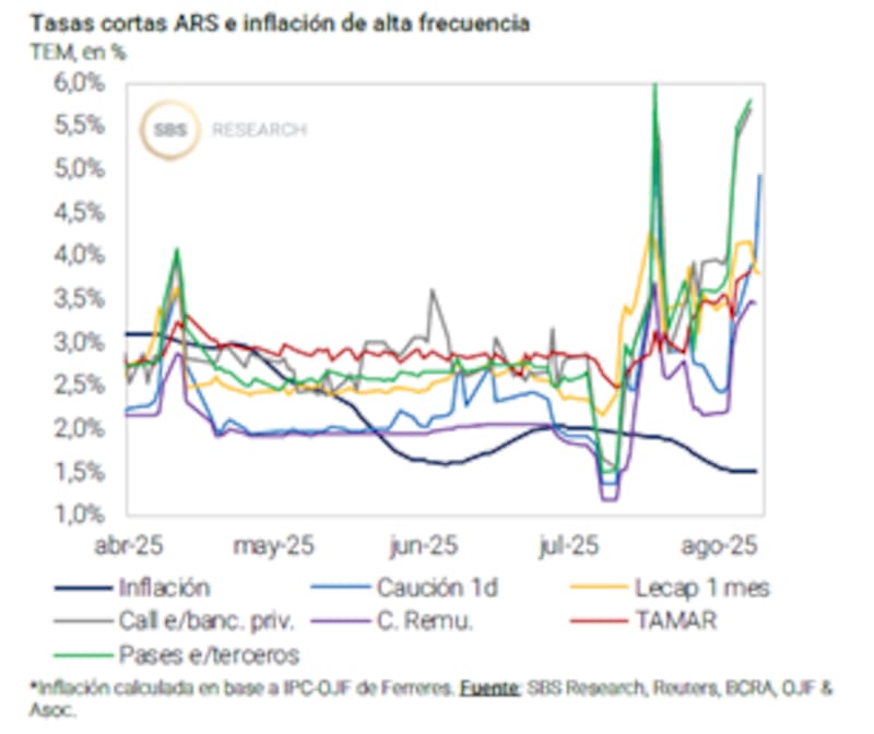 "La presión alcista sobre tasas en pesos obedece al incremento en los requerimientos de encajes bancarios, que redujeron la liquidez del sistema. Ante la presión sobre tasas, el BCRA dispuso la creación de una nueva ventanilla de pases activos para aliviar necesidades de liquidez", explicó.