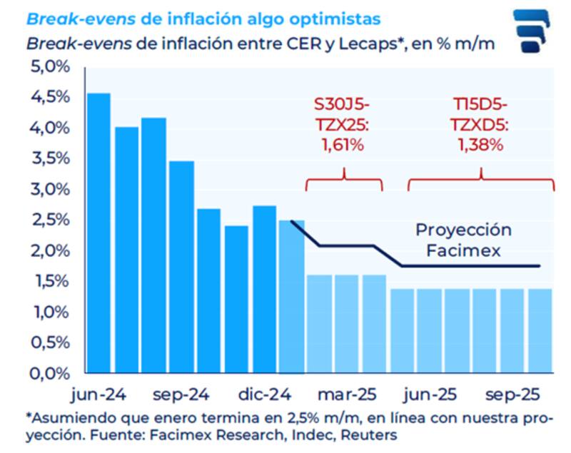 "El mercado descuenta que la inflación convergerá inmediatamente al ritmo inducido por el nuevo crawling peg y la inflación internacional, algo que luce optimista tras la inercia que vienen mostrando los no transables. Concentramos la exposición en la sobre castigada Lecap de enero (S31E5) y la complementamos con exposición al Boncer de marzo (TZXM5), hoy el CER más corto", indicaron.