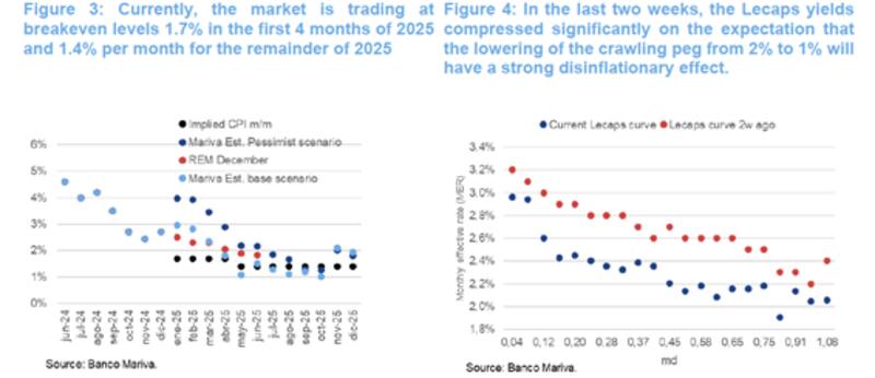 "Los bonos siguen cotizando en un escenario de fuerte desinflación reflejado en una curva de rendimientos invertida, con tasas de inflación de equilibrio en niveles del 1,7% en los primeros 4 meses de 2025 y del 1,4% mensual para el resto de 2025. Este escenario es mucho más optimista que nuestro escenario base, en el que vemos una inflación que alcanza el 23,4% en 2025 frente al 19% que cotiza el mercado", indicaron.
