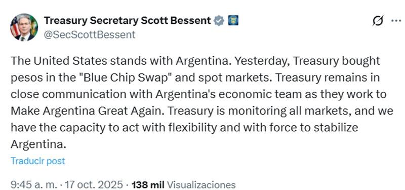 "El Tesoro se mantiene en estrecha comunicación con el equipo económico argentino mientras trabaja para que Argentina vuelva a ser grande. El Tesoro está monitoreando todos los mercados y tenemos la capacidad de actuar con flexibilidad y contundencia para estabilizar a Argentina", sostuvo en su red social "X".