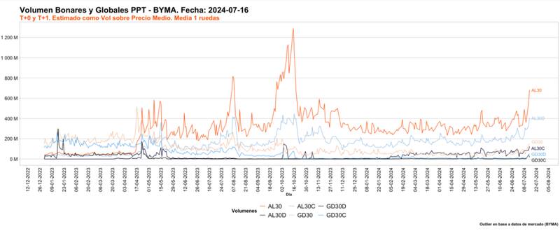 "Estos bonos, dentro del abanico de los títulos soberanos en dólares, son los más líquidos del mercado local. Cualquier variación en términos de volumen es más fácil de notar en estos activos, que también suelen ser utilizados para operaciones de contado con liquidación", agrega Tobías Sánchez, analista de research de Cocos.