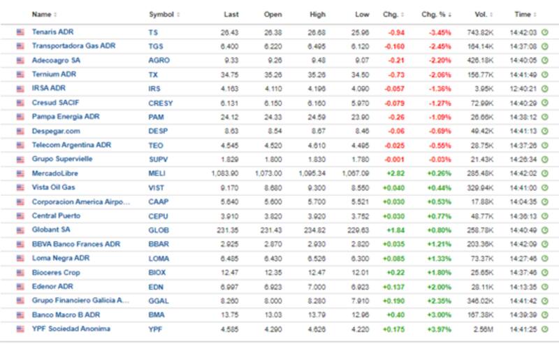 En lo que respecta a las acciones, los ADR de empresas argentinas operaron mixtos. Por el lado de las subas, las acciones de YPF son las de mayor evolución, con avaneces de 4%, seguida por las de Banco Macro y Grupo Financiero Galicia, que ganaron 3% y 2,3 por ciento, respectivamente. Edenor subió 2% y Bioceres rebotó 1,8 por ciento.