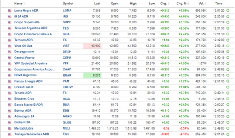 Durante la jornada, las acciones argentinas en Wall Street operaron moderadamente al alza, con un promedio de 1%, a excepción de los ADR de Loma Negra, que se separaron del pelotón y subieron 11,4%.
