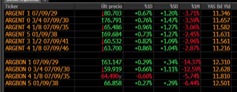 Los bonos Globales del tramo corto suben 0,67% en el GD29 y de 0,76% en el GD30. En el tramo medio, los títulos a 2035 y 2038 registran avances de 0,96% y 0,73% respectivamente.