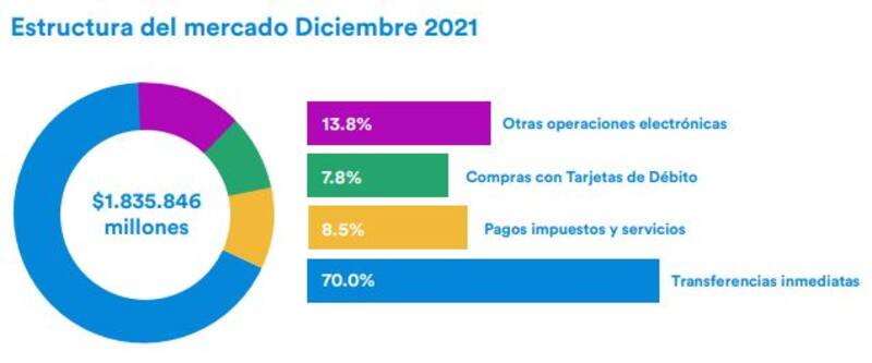 En diciembre, se registró un total de $ 1,84 billones en transacciones monetarias a través de los dispositivos móviles, fijos y tarjetas de débito bancarias. Este monto representó un incremento de 23% respecto al mes previo y de casi 100% en comparación con el mismo mes del año anterior.