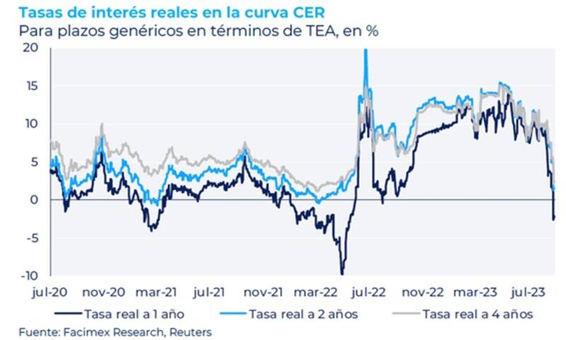 En esa línea, resaltaron que las tasas reales de los títulos CER comprimieron y se mantienen en terreno negativo hasta mediados de 2024.