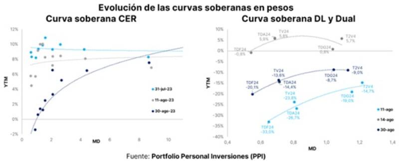 Por lo tanto, la demanda por cobertura inflacionaria a través de los bonos CER, y por cobertura cambiaria, vía bonos dólar linked, generó que los rendimientos de dichos bonos colapsen a niveles más bajos desde la crisis de deuda en pesos de junio de 2022.