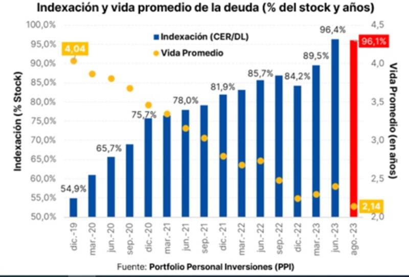 Esto es marcado deterioro respecto de los valores que se evidenciaban en 2019, cuando solamente el 55% de la deuda estaba indexada a inflación y/o devaluación.