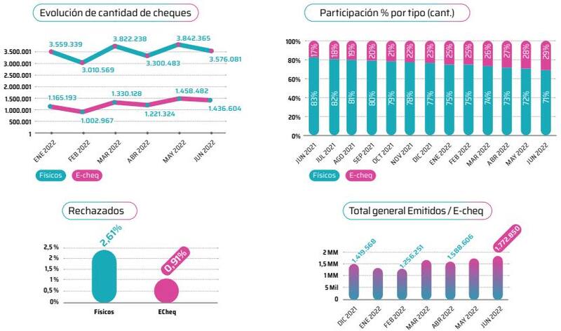 La entidad destacó además que, de a poco, los cheques electrónicos le están ganando terreno a los tradicionales. Un año atrás, los cheques electrónicos representaban apenas el 17% del total de las operaciones de ese mercado, mientras que al cierre del primer semestre de este año significaron el 29 por ciento.