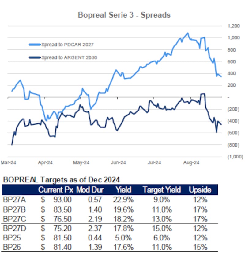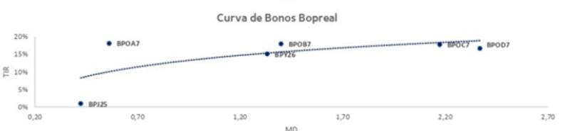 Además, agregaron que "en un análisis de riesgo/retorno, el Bopreal (BPY26) es el más atractivo, dado su rendimiento más atractivo sobre el BPJ25 y su baja duración, siendo así más defensivo que los Bopreal más largos".