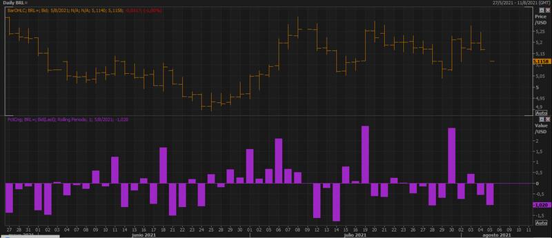Si bien el tipo de cambio en Brasil se ubica prácticamente en los mismos niveles que comienzo de año, la moneda se apreció 14,4% desde sus máximos históricos de R$ 5,97.