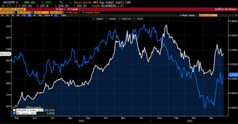 El contado con liquidación (CCL) en Argentina ha tenido una dinámica similar a la del real brasileño, con una apreciación en los primeros meses del año. Por lo tanto, podría entenderse que la suba de tasas de Brasil es una buena noticia para el tipo de cambio en Argentina.