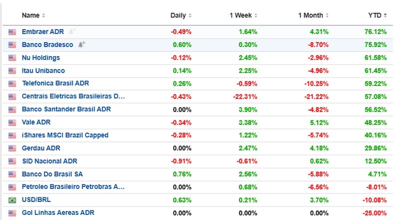 Entre los papeles que mas suben se destacaron Embraer, con un avance de 76%, seguida por Banco Bradesco, Nu Holdings, Itaú, Telefónica Brasil, Centrales Eléctricas Brasileras, Banco Santander Brasil y Vale, con subas de entre 48% y 75% en 2025. Entre los de peor performance se encuentran Petrobras, que cae 8% en 2025 y Banco Do Brasil, que sube solo 4%.