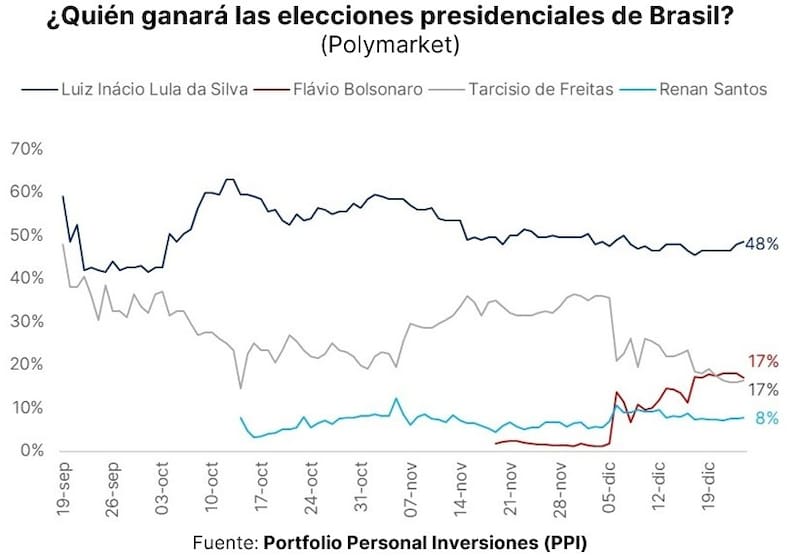Los analistas de Portfolio Personal Inversion (PPI) detallaron que, en términos de probabilidades, los mercados de apuestas hoy colocan a Luiz Inácio Lula da Silva como favorito, con cerca de 48% de chances de victoria.
