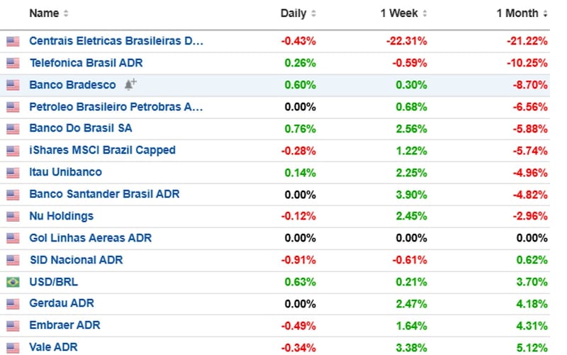 En el ultimo mes, el EWZ cae 6%, mientras que papeles como Centrales Eléctricas Brasileras, Telefónica Brasil, Bradesco, Petrobras y Banco Do Brasil, muestran perdidas de entre 6% y 21%.
