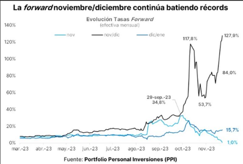 "Dado que el contrato de noviembre cedió y el de diciembre se incrementó, la tasa forward noviembre/diciembre se disparó a un récord de 127,9% mensual desde 121,9%, marcando un nuevo máximo histórico por tercer día consecutivo. Si bien el mercado podría estar descontando parcialmente una dolarización, consideramos que pricea más una rápida salida del Cepo a partir del 10 de diciembre 12 con la asunción de Milei", comentaron desde PPI.