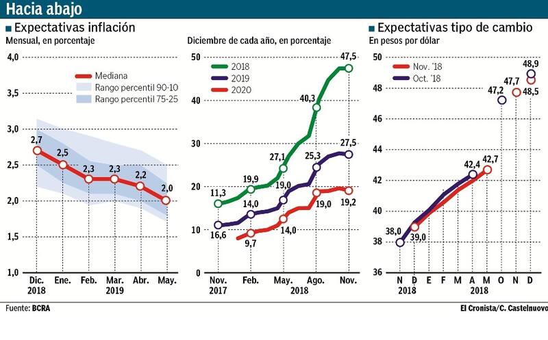 Las expectativas de inflación bajaron respecto del relevamiento del mes de octubre en prácticamente todos los horizontes temporales relevados. Para los próximos 12 meses (interanual noviembre 2018 noviembre 2019) son 29,0% según el promedio y de 28,6% según la mediana. Esto es 3,1 puntos porcentuales menos que en octubre según el promedio y 2 puntos según la mediana. Esta es la tercera caída de este indicador según el promedio (en octubre cayó 0,8 puntos porcentuales y en septiembre 0,5 puntos) y la segunda según la mediana (en octubre cayó 1,3 puntos).