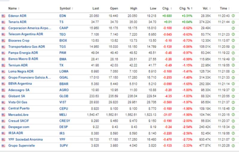 Salvo Edenor y Tenaris, que suben 3,5% y 0,04%, todo el resto de los ADR cotizan a la baja.