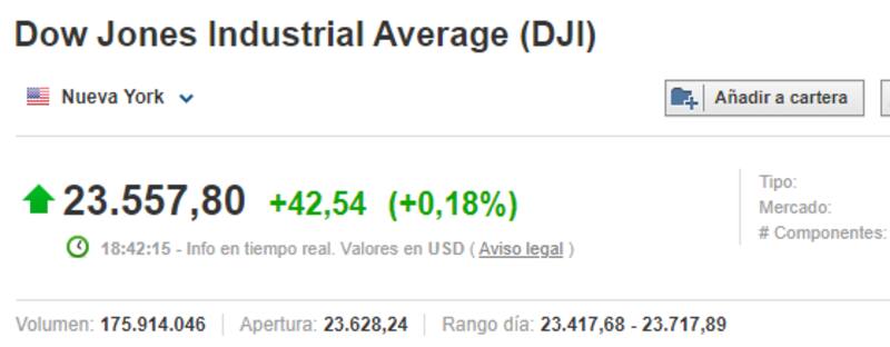 El S&P 500 abrió en alza de 0,2%. El Dow Jones Industrial ganó 71 puntos, 0,3%, a 23.587 y el Nasdaq bajó 0,18%.