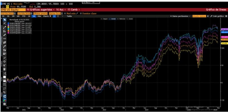 En el ultimo mes, la deuda emergente registra perdidas de 1% y baja más del 2,5% desde los máximos previos al estallido de la guerra.