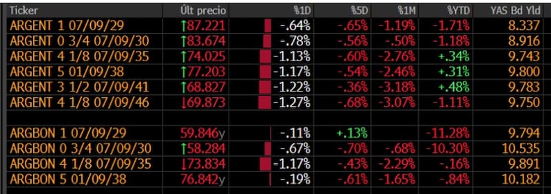 En el tramo medio, los Globales a 2035 y 2038 evidencia perdidas de 1,1% cada uno, mientras que, en el tramo más largo, los títulos a 2041 y 2046 registran descensos de 1,2% cada uno.