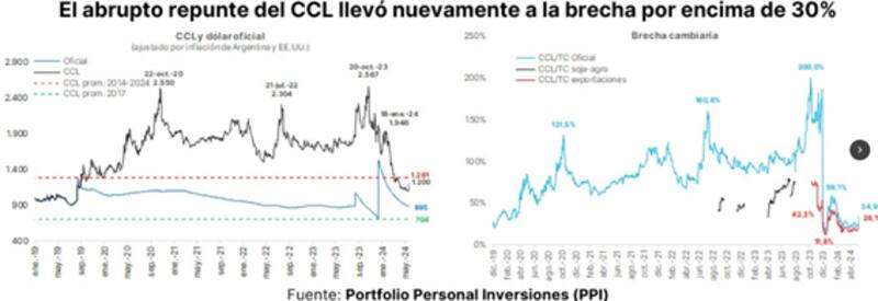"A pesar de este abrupto rebote, el CCL se ubica 6,3% por debajo de su promedio de los últimos 10 años y es 38,3% inferior al máximo de la administración Milei del 18/01. Por su parte, la brecha cambiaria entre el CCL y el oficial saltó de 24,3% el viernes a 34,9% ayer, a la par que la de los exportadores se disparó de 18,5% a 26,1% en el mismo período. Ambas se encuentran en el nivel más alto desde el 20 de febrero (35,9% y 26,8%, respectivamente), pero todavía permanecen lejos del pico de la gestión actual de 59,1% y 42,3% del 22 de enero", comentaron.