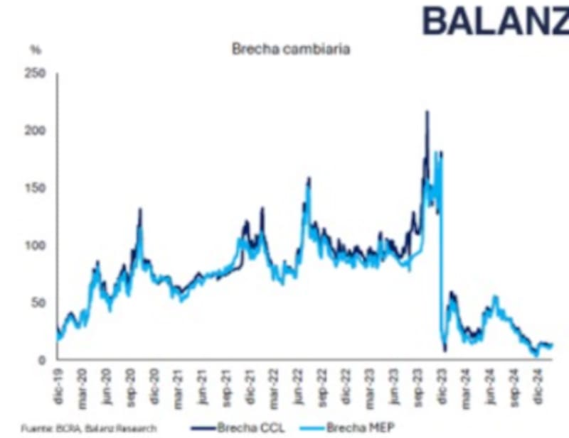 Cabe destaca que la brecha cambiaria se matienei estable desde diciembre, en un rango acotado de entre 10% y 15%.