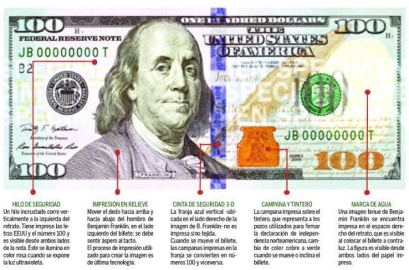 Además el diseño del billete de u$s 100 mejoró y conservó tres características de seguridad eficaces de los diseños anteriores: la marca de agua del retrato, el hilo de seguridad y el 100 que cambia de color.