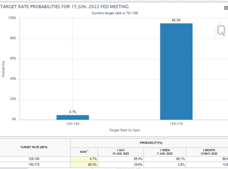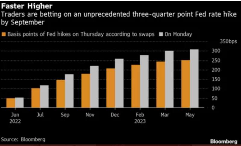 El mercado ahora prevé aumentos consecutivos de la tasa de 75 puntos básicos en junio y julio, seguidos de un movimiento de 50 puntos básicos en septiembre y movimientos de 25 puntos básicos en noviembre y diciembre, lo que lleva la tasa de los fondos federales a un rango de 3,25% a 3.5% para finales de año.
