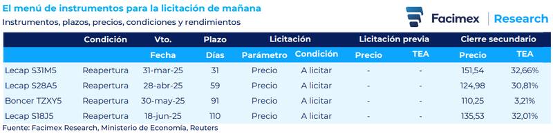 En el menú de instrumentos que ofrecerá el Tesoro, la duración más corta se encuentra entre las Lecap. Una de ellas, la S31M5, vencerá en 31 días, mientras que la S28A5 lo hará en 59 días y la S18J5, en 110 días. Por su parte, el Boncer cupón cero TZXY5 vencerá en 91 días. Es decir, el más largo vencerá después de mediados de junio.