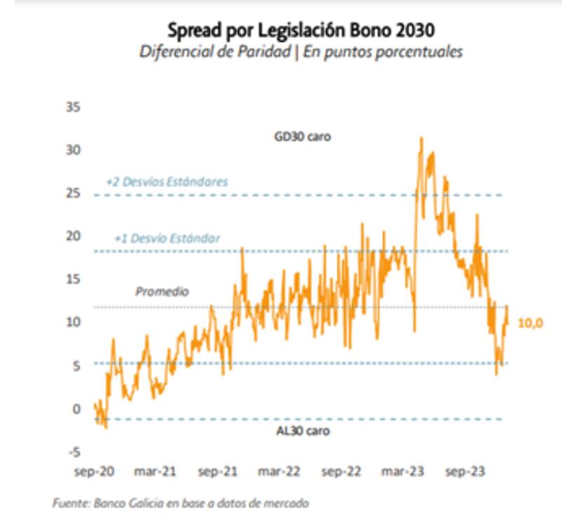Los analistas de Banco Galicia ven que, con el diferencial de legislación entre los bonos de ley internacional (Globales) y los de ley local (Bonares) en niveles de 10%, se da una oportunidad de arbitraje.